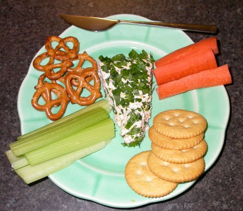 When ready to serve, cut cheese spread into 12 wedges.  Serve with crackers, pretzels, celery sticks, and carrot sticks.